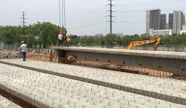 5月18日上午9時,濱河南路拓寬改造工程第一塊T型板梁正式開始吊裝。該橋設(shè)計寬26米,橋跨18米,橋型為一跨簡支變截面肋梁橋,主梁采用裝配式后張預(yù)應(yīng)力混凝土變截面T梁,吊裝后濕接。經(jīng)過連續(xù)不間斷作業(yè),于下午16時圓滿完成七塊主梁、兩塊邊梁,共計九塊板梁的吊裝任務(wù),比原計劃提前一天,至此標志著橋梁主體結(jié)構(gòu)工程順利完成。為保障此次吊裝作業(yè)的順利進行,項目部科學(xué)部署,精心組織,提前策劃,并與交警等相關(guān)部門充分溝通,確定合理的運輸路線和時間。項目部設(shè)立吊裝安全保障小組、明確責(zé)任分工;詳細制定切實可行的施工方案,做到以方案指導(dǎo)施工;認真做好各項施工前準備工作:包括技術(shù)準備、機械設(shè)備準備、勞動組織準備、施