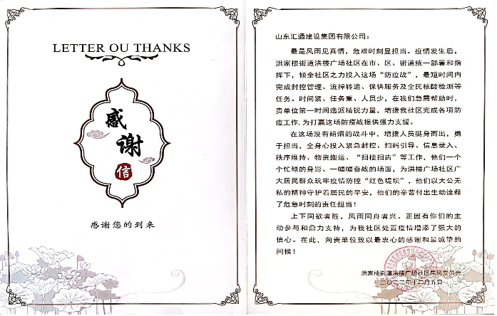 “抗疫奮戰(zhàn) 堅守一線 共駐共建 情暖民心” 。12月5日,洪樓廣場社區(qū)黨支部書記尹延偉給集團匯通公司下沉社區(qū)服務隊送來錦旗和感謝信,表達了對志愿隊在此次抗擊疫情期間不分晝夜、義無反顧堅守一線的高度贊揚和誠摯謝意。